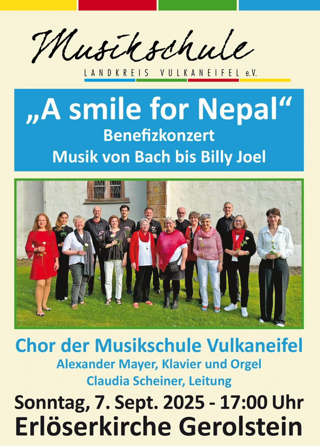 Am 07. September um 17 Uhr gestaltet der Chor der Musikschule Vulkaneifel in der Erlöserkirche Gerolstein ein Benefizkonzert für den Verein „A smile for Nepal“.